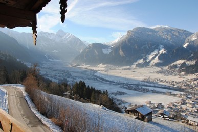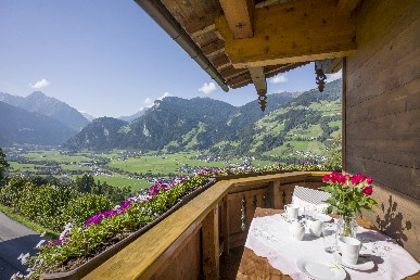 Großer Balkon mit Panoramablick und Parkplatz am Haus
